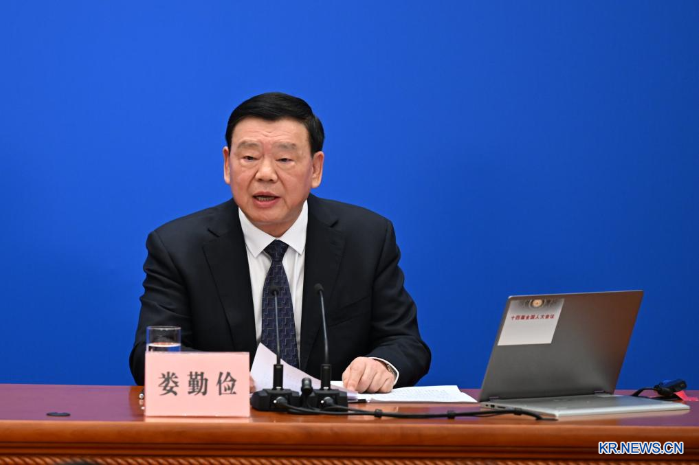 [신화망 베이징 3월4일] 제14기 전국인민대표대회(전인대) 2차 회의 기자회견이 4일 베이징 인민대회당에서 열렸다. 러우친젠(婁勤儉) 대회 대변인은 대회 어젠다 및 전인대 업무 관련 국내외 기자들의 질문에 답변했다.[촬영/신화사 기자 차이양(才揚)]
