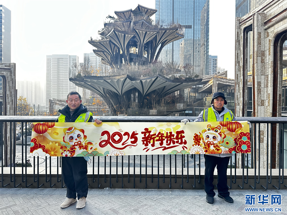 2025年1月1日,在刚刚落成的西安新地标西安“生命之树”下,中建五局的一线建设者们为全国网友送新年祝福。胡玥摄