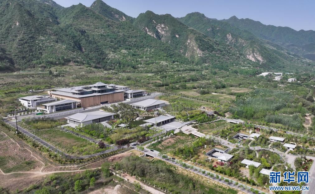 位于西安市鄠邑区的国家版本馆西安分馆和周边的秦岭景色(4月16日摄,无人机照片)。
