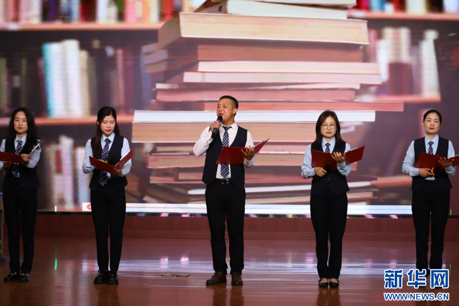 余干县实验小学举行校园读书节成果展示暨颁奖典礼,老师们正在阅读朗诵。新华网发 韩海建 摄