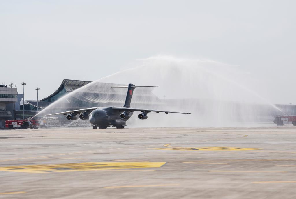 9月12日,第十二批在韩中国人民志愿军烈士遗骸回国。这是在沈阳桃仙国际机场,接运烈士遗骸回国的运-20专机通过水门。新华社记者 潘昱龙 摄