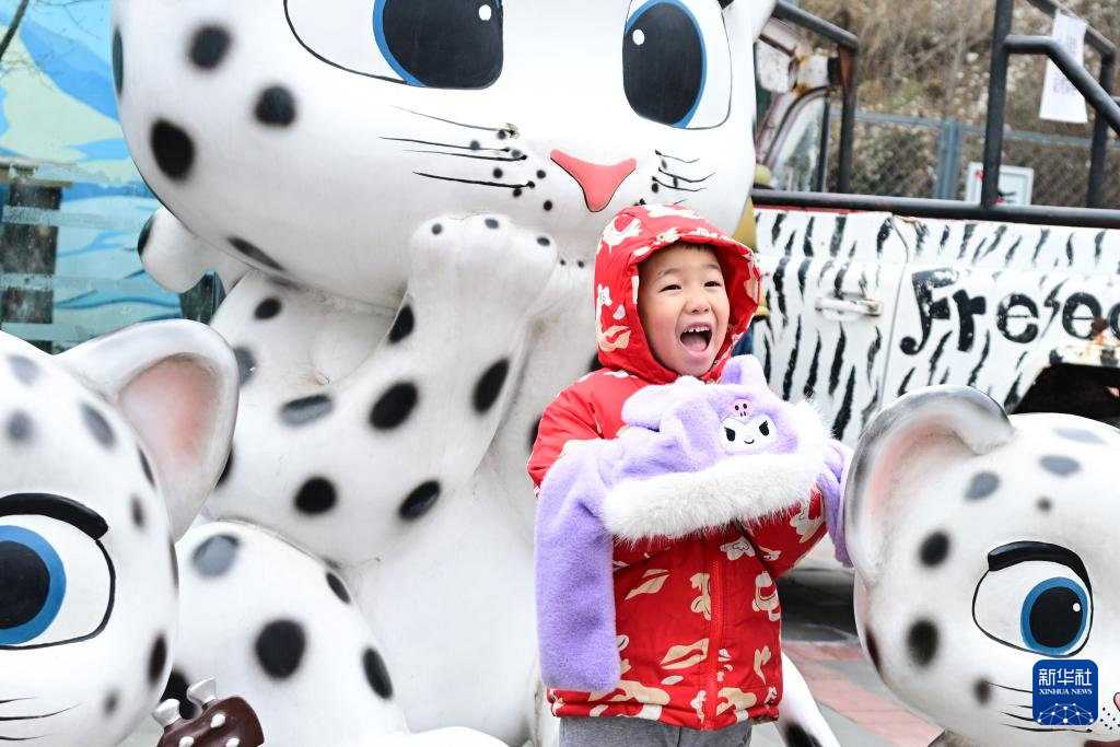11月22日,在青海省西宁野生动物园,一名小朋友在雪豹雕塑前拍照。新华社记者 齐芷玥 摄