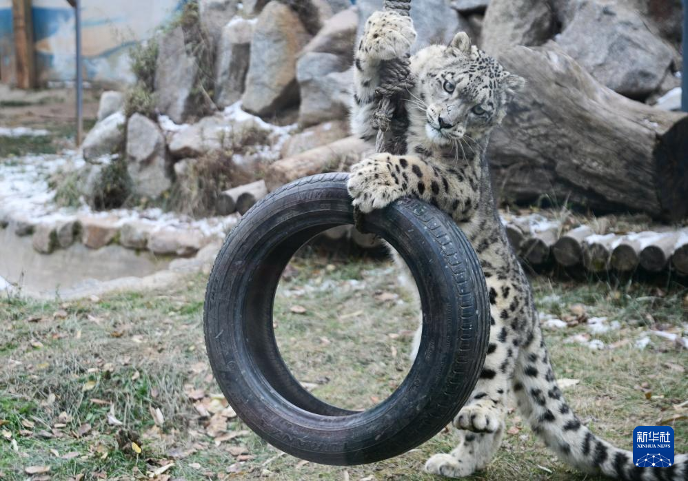 11月22日,在青海省西宁野生动物园雪豹馆,雪豹 “凌小芒”在玩耍。新华社记者 齐芷玥 摄