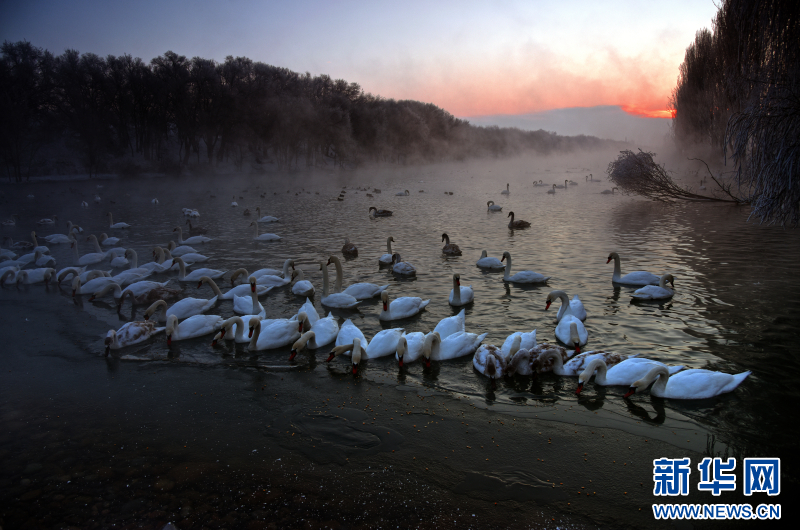 1993年11月,两只疣鼻天鹅带着3个孩子突然飞到夏合勒克村,落在了村民韩新林门口的鱼塘中。韩新林连续几天给天鹅投放食物,帮它们熬过寒冬。没想到,这个善意的举动,引来了越来越多天鹅年年到此过冬。从最初的一家五口,增加到如今超过1000只的庞大家庭。每年冬季,它们从远方如期而至,与这里的雾凇、晨雾和霞光,共同绘就一幅生命与自然相守的温暖画卷。