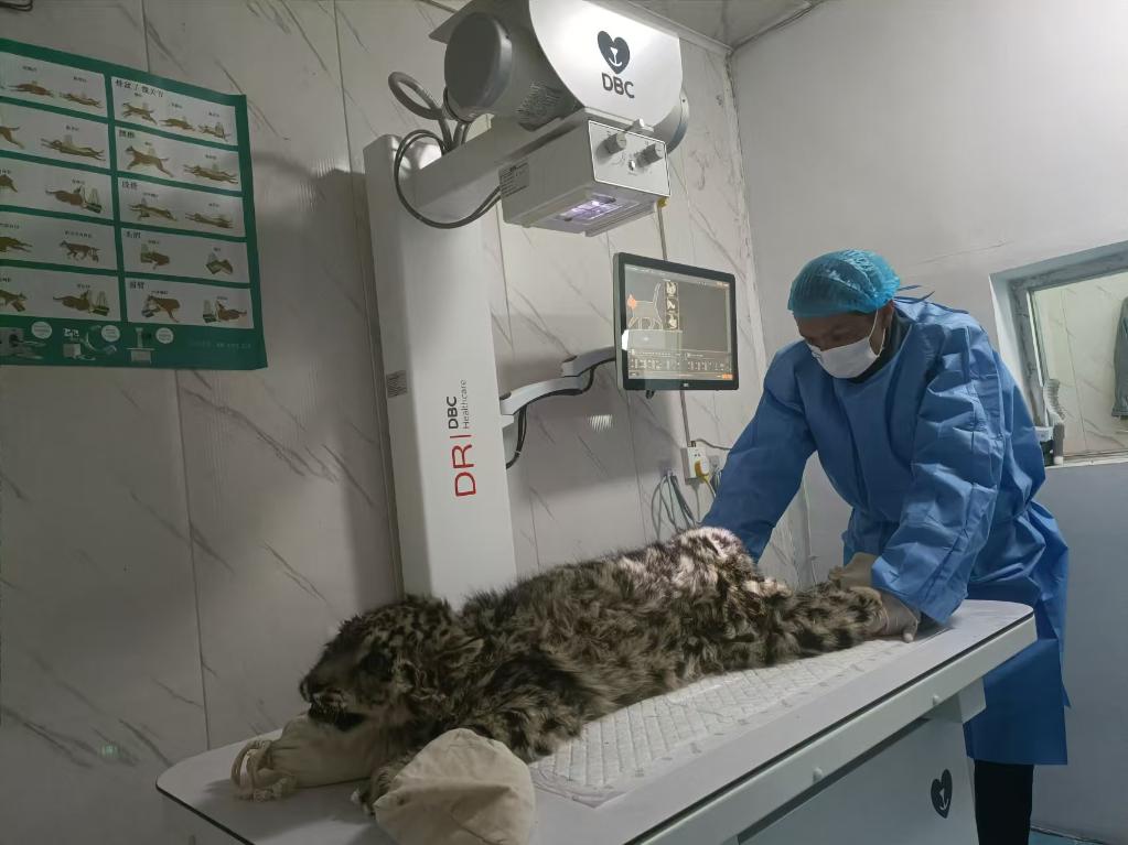 雪豹“凌小蛰”在恒温氧舱中接受治疗。