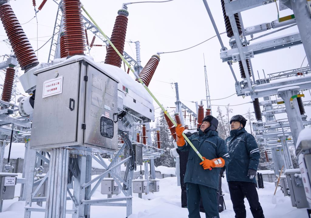 3月11日,在新疆阿勒泰地区喀纳斯景区,国网阿勒泰供电公司运维人员对设备进行清雪作业。新华社发(努尔别克·努尔曼 摄)
