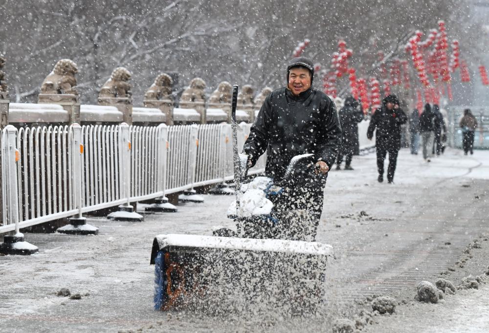 3月11日,环卫公司工作人员在新疆乌鲁木齐市西大桥附近清理积雪。新华社记者 王菲 摄