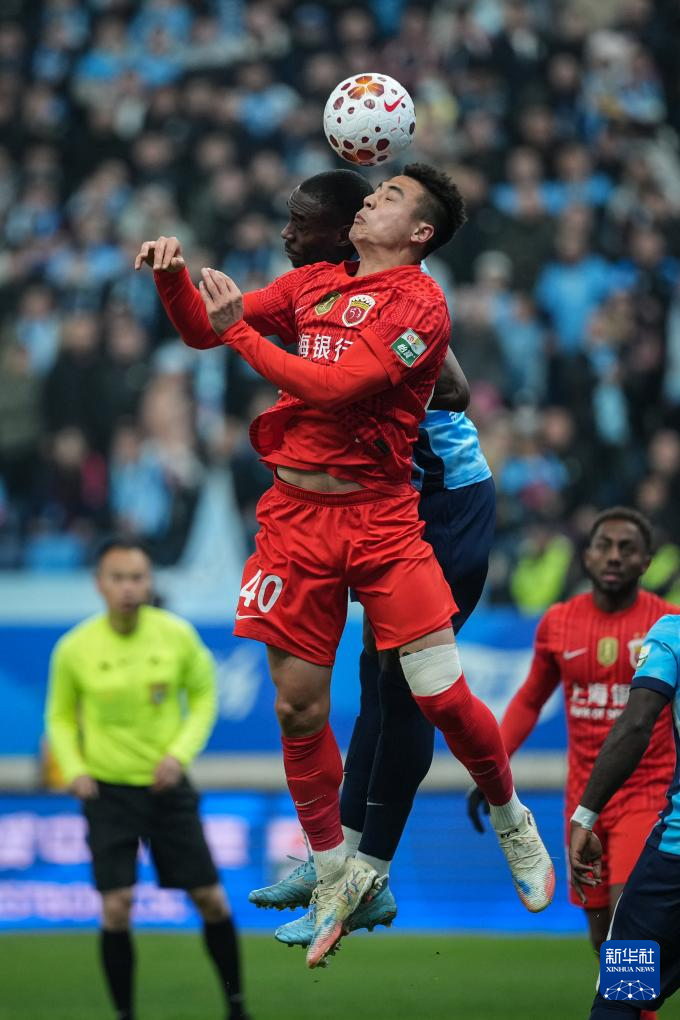 3月20日,上海海港队球员吾米提江·玉苏普(前)在比赛中争顶头球。