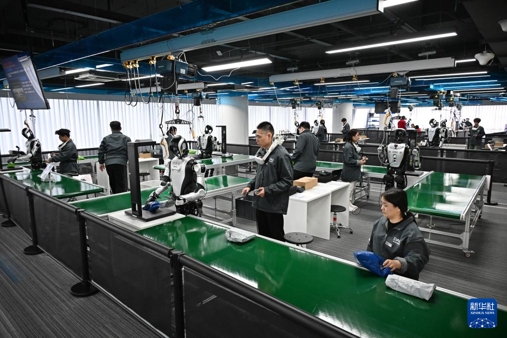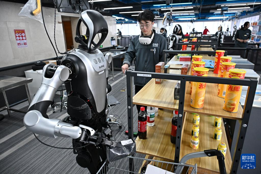 3月23日,在青岛市人形机器人数据采集训练场,工作人员对人形机器人进行训练和数据采集。新华社记者 李紫恒 摄