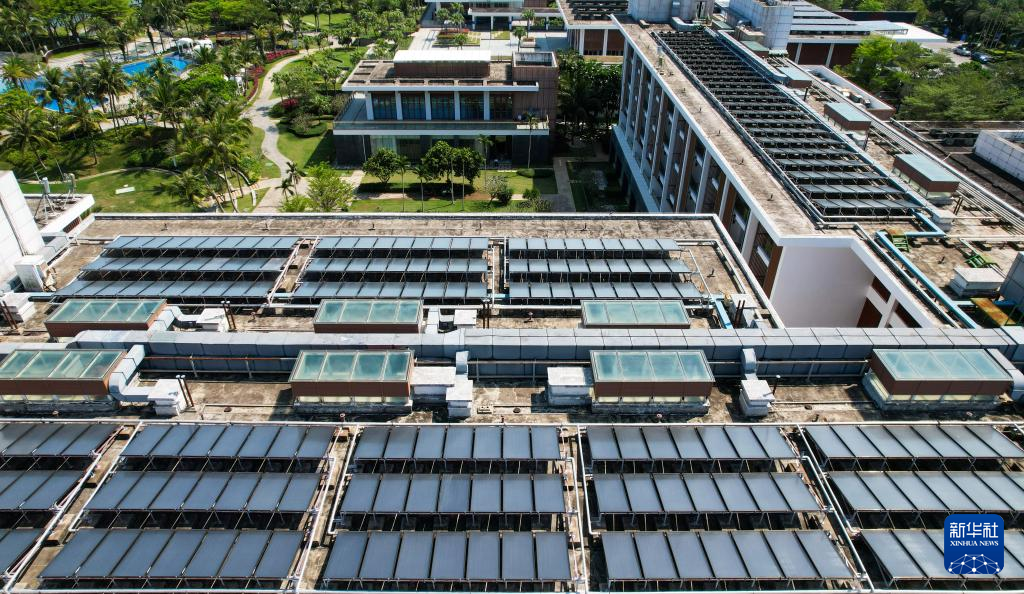 在博鳌零碳示范区拍摄的东屿岛大酒店屋顶的光伏设备(3月19日摄,无人机照片)。