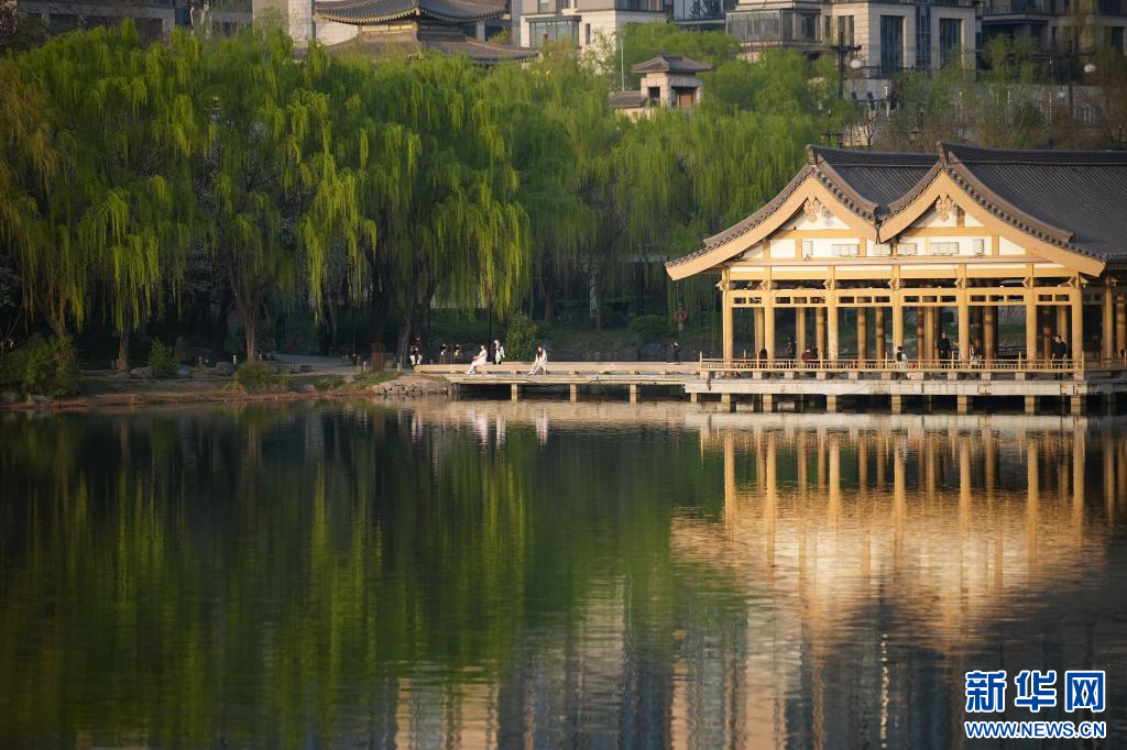 3月24日,游人在西安曲江池遗址公园赏景、拍照。