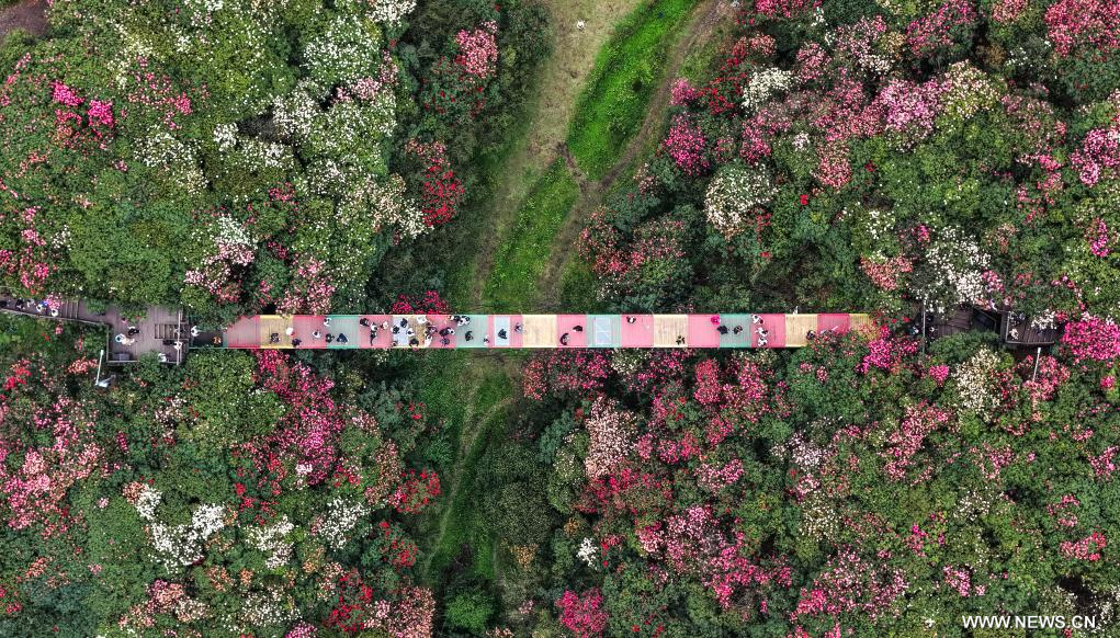 بيجيه 3 أبريل 2026 (شينخوا) في الصورة الملتقطة أول أبريل 2026، سياح يزورون منطقة ذات مناظر خلابة لأزهار الأزالية في مدينة بيجيه بمقاطعة قويتشو في جنوب غربي الصين.