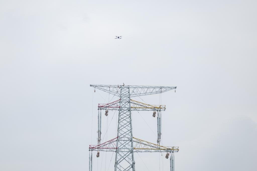 以往,无人机跨江放线需要高空作业人员手动解绑导引绳。而此次大载重无人机搭载四段投掷器飞抵塔基上空后,只需数十秒就可完成自动抛投导引绳,提升了作业安全性和效率。