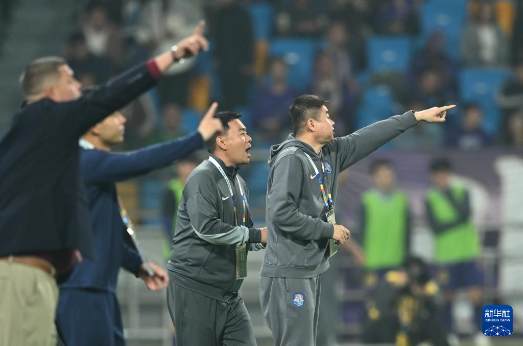 4月12日,天津津门虎队主教练于根伟(右一)在场边指挥。新华社记者 孙凡越 摄
