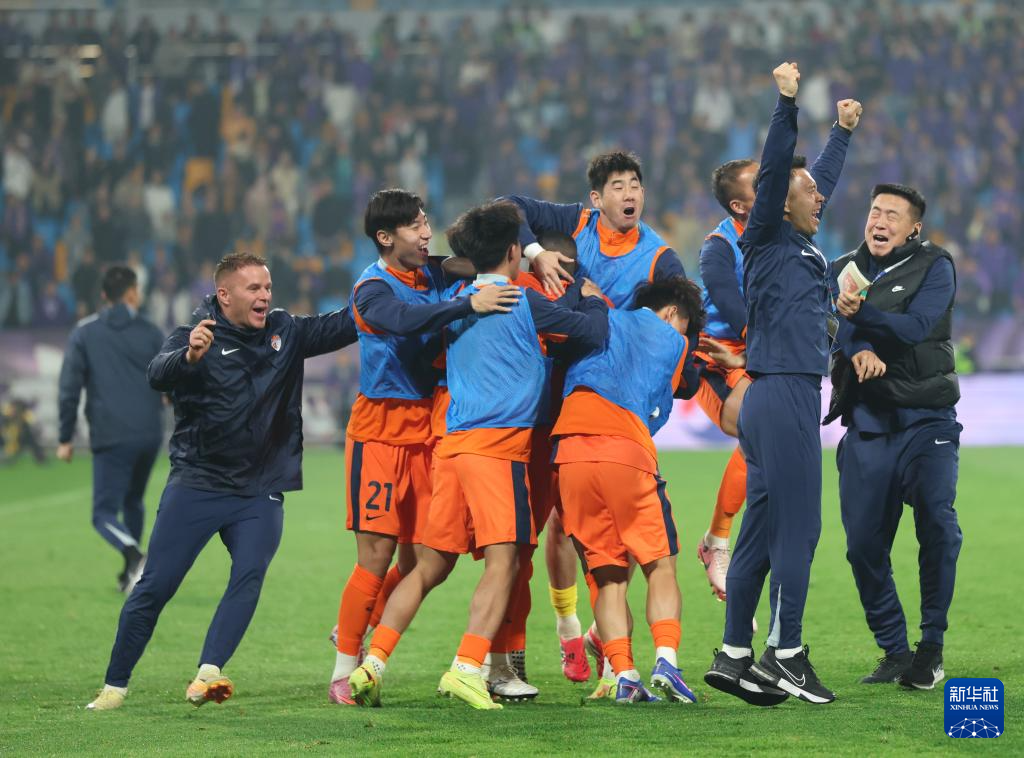 4月12日,青岛海牛队球员在球队下半场补时阶段扳平比分后冲进场内庆祝。新华社记者 孙凡越 摄pagebreak