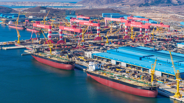 4艘超大型原油运输船出坞下水;6艘8.2万载重吨散货船出坞下水……节拍化建造、批量化交付,强大的制造能力让恒力集团旗下恒力重工这匹造船业“黑马”得到了来自希腊、挪威等国外船东的青睐。恒力集团董事长陈建华说,今年每个月要交付的船多达6艘以上,造船订单已排到2030年,100%来自欧美市场。