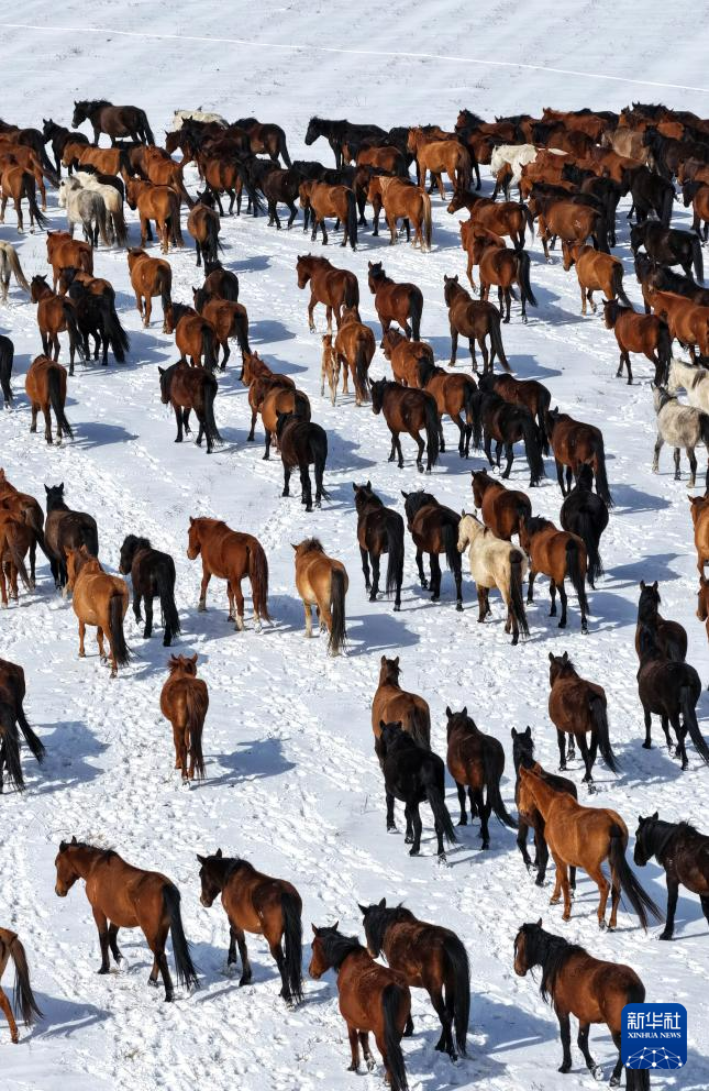 4月14日拍摄的山丹马场的转场马群(无人机照片)。新华社发(王超 摄)