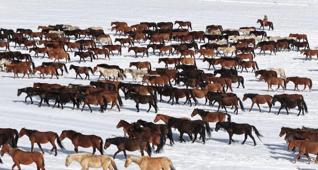 4月14日,山丹马场的牧马人组织马群转场(无人机照片)。新华社发(王超 摄)
