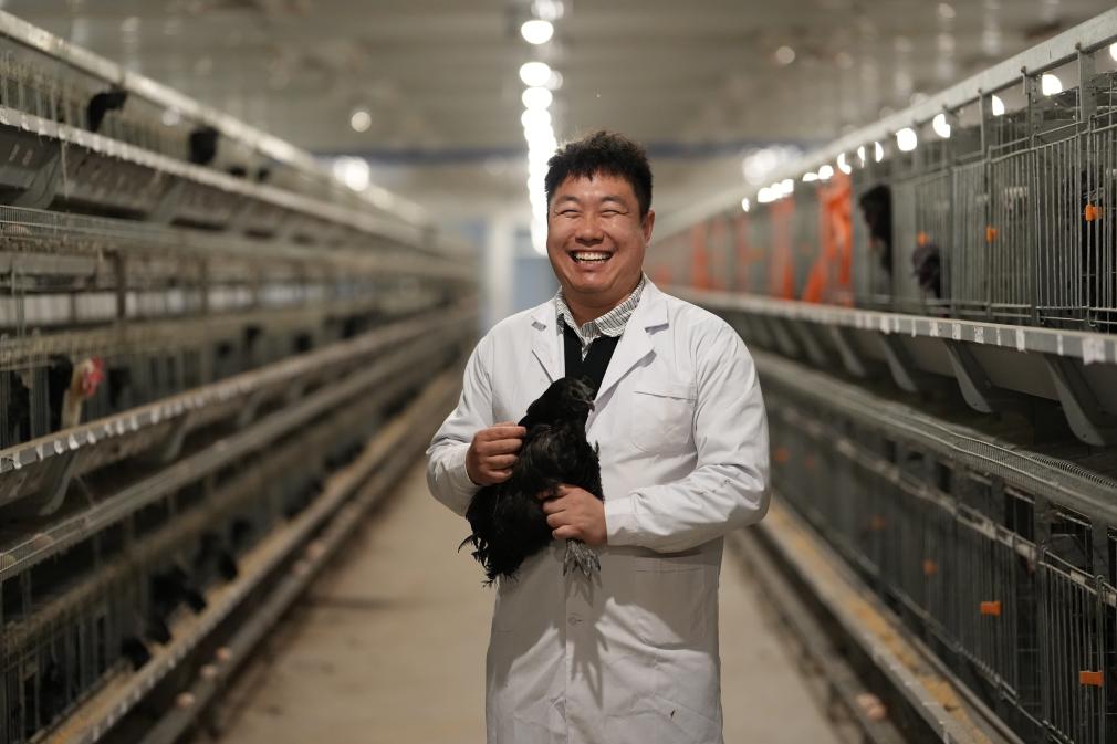 4月9日,西北农林科技大学博士研究生秦凯龙在陕西武功家禽科技小院养殖区内查看略阳乌鸡杂交后代成长情况。新华社记者 李一博 摄