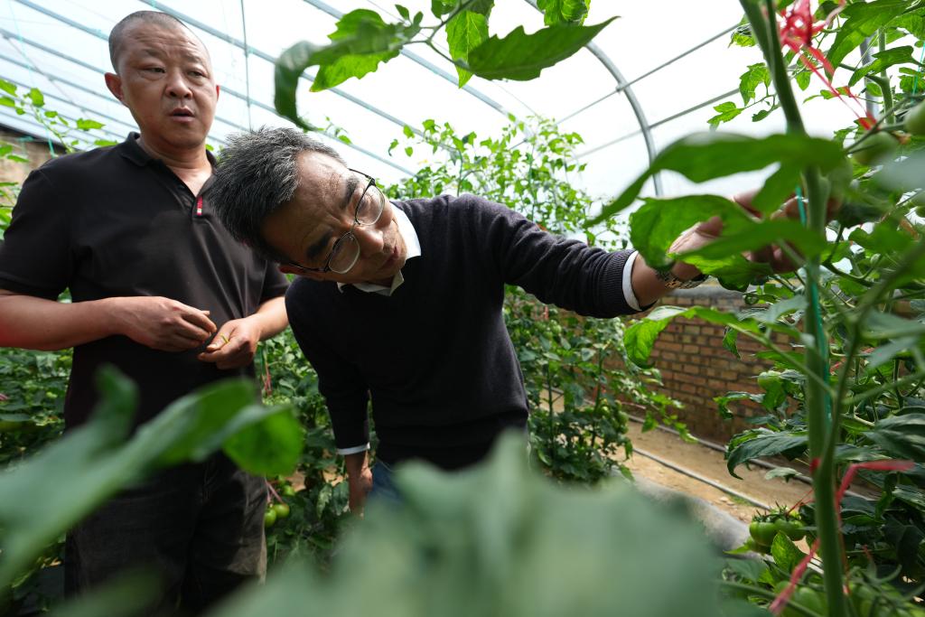 4月9日,陕西泾阳蔬菜科技小院首席专家、西北农林科技大学推广研究员张明科(右)在泾阳县三渠镇白杨村菜农张东闯的蔬菜大棚内查看西红柿生长情况。新华社记者 李一博 摄