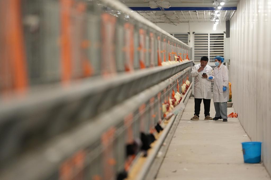 4月9日,西北农林科技大学博士研究生周雨昕(右)和工作人员在陕西武功家禽科技小院养殖区进行蛋鸡人工受精前的数据核对。新华社记者 李一博 摄