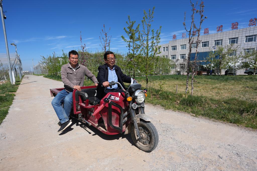 4月10日,延安洛川苹果试验示范站科技小院首席专家、西北农林科技大学教授马锋旺(右)和博士研究生魏江彤前往试验田。新华社记者 李一博 摄