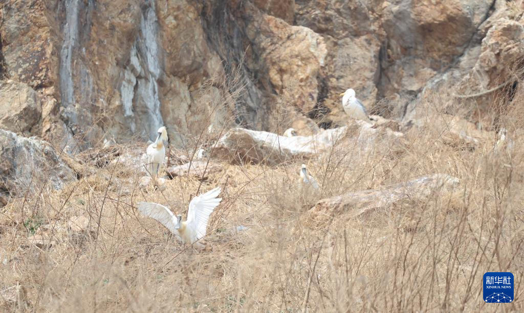 4月14日,辽宁省庄河市石城乡形人坨,黑脸琵鹭和海鸥一同在崖壁上栖息。
