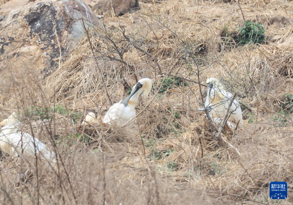 4月14日,辽宁省庄河市石城乡形人坨,黑脸琵鹭在崖壁上的巢中栖息。