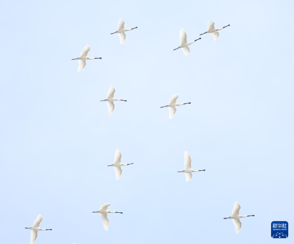 4月14日,一群黑脸琵鹭在辽宁省庄河市石城乡形人坨上空飞行。