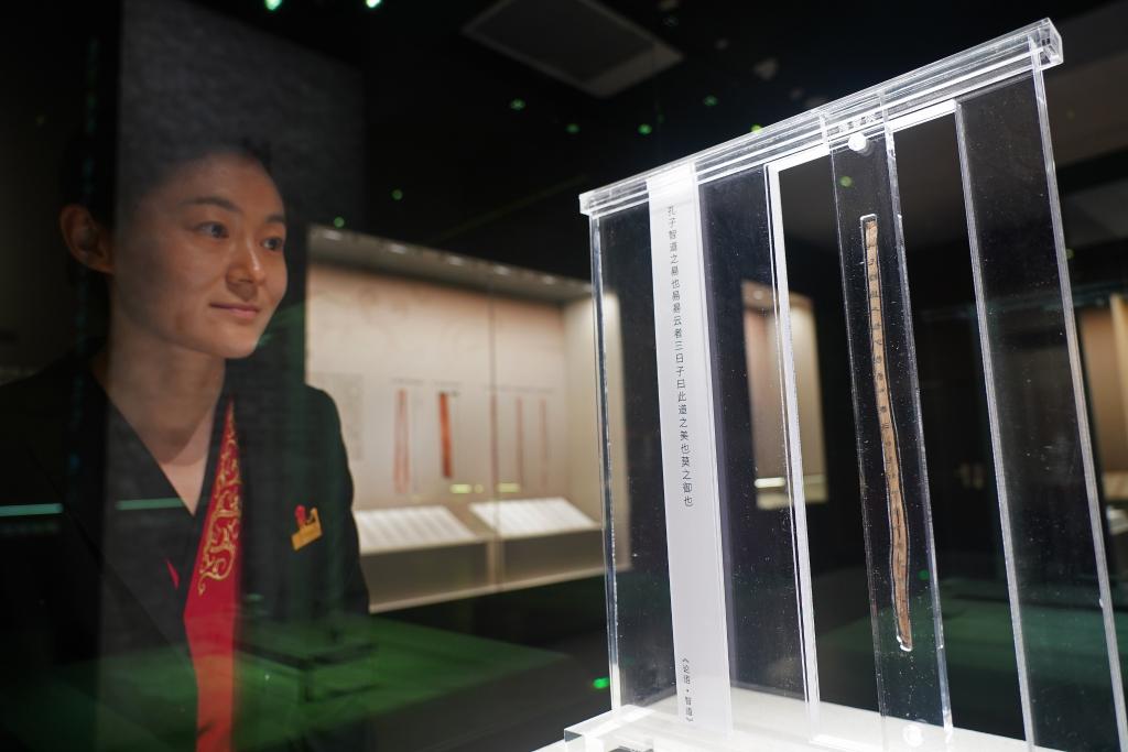 讲解员在观看齐《论语·智道》简(4月13日摄)。
