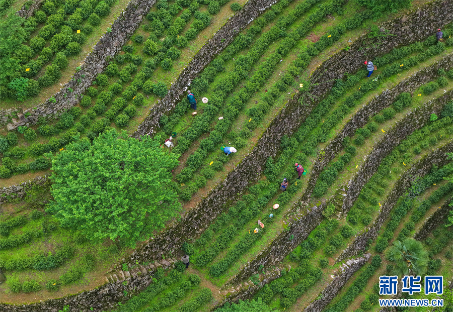 4月14日,航拍的安徽省黄山市歙县璜田乡蜈蚣岭村梯田茶园(无人机照片)。