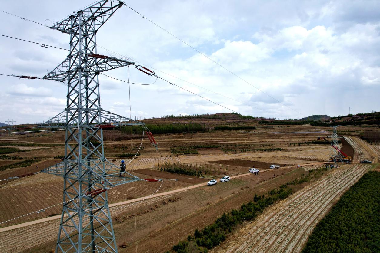 4月14日,在宁夏固原市泾源县大湾乡,国网固原供电公司员工正在瓦亭至隆德改接绿塬变110千伏线路工程9号至10号杆塔扩建工程现场进行导地线展放及改接工作。