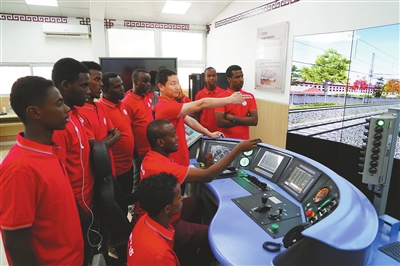 吉布提鲁班工坊师生在中方教师的指导下学习机车驾驶。