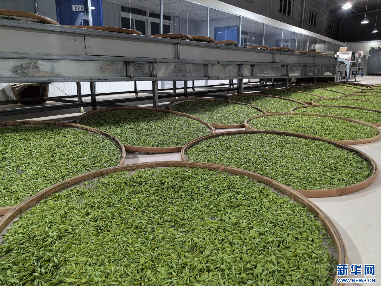 2026年4月2日,陕西省安康市汉阴县龙寨茶业生产车间正在进行鲜叶摊凉工序。新华网发(刘东摄)