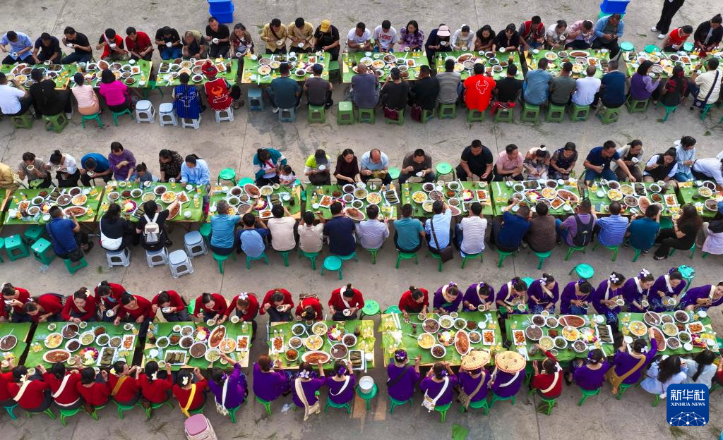 近日正值泼水节,“民族团结长桌宴”在云南省普洱市西盟佤族自治县的傣族村寨里举行。
