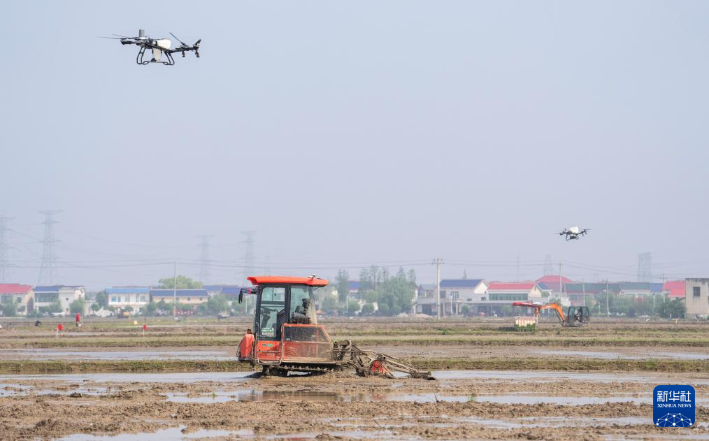 4月17日,在高塘岭街道湘江村智慧农场,无人驾驶旋耕机与农用无人机配合,进行翻耕和施肥。新华社记者 陈思汗 摄