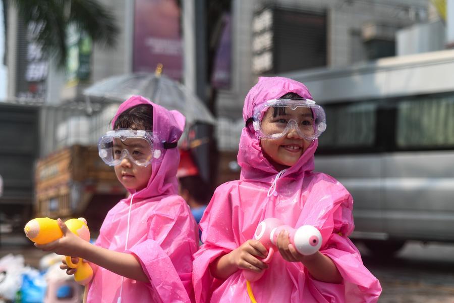15日、会場の広場で水かけ祭りを楽しむ子ども。(景洪=新華社記者/江文耀)