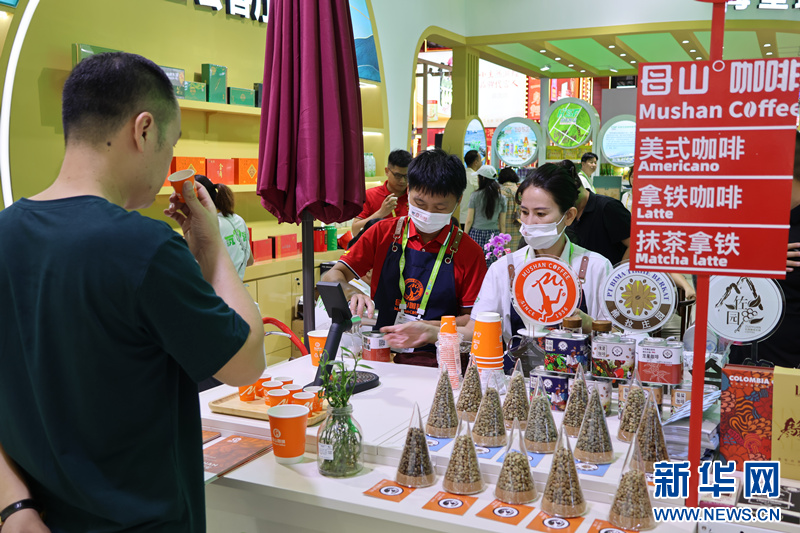 工作人员为观展观众提供母山咖啡试饮服务。新华网发(谢雅妮 摄)