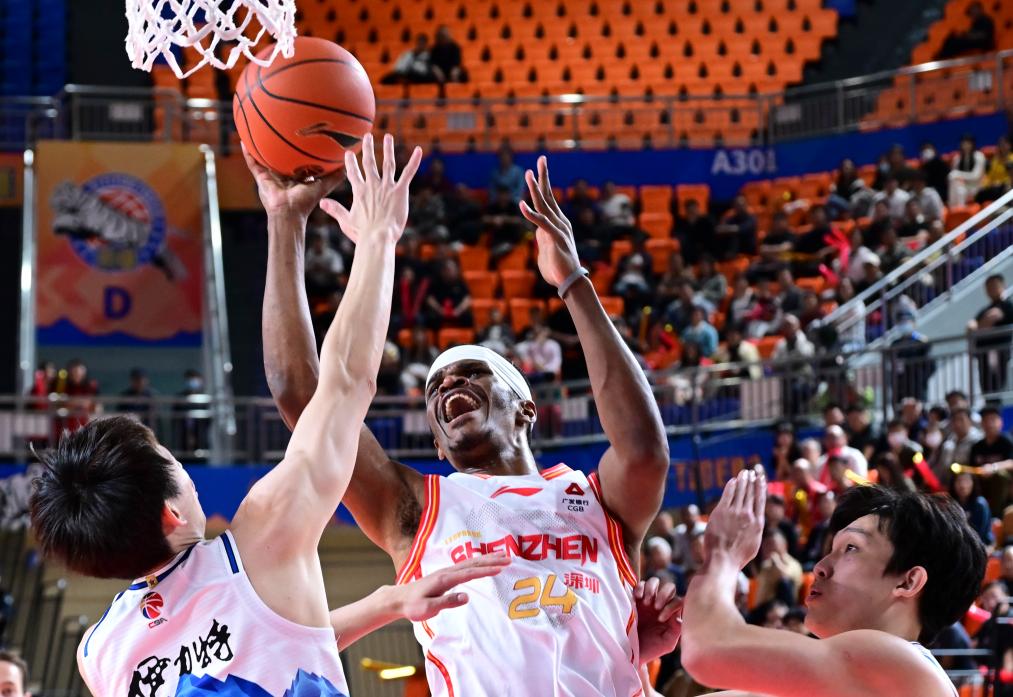 4月15日,深圳马可波罗队球员史密斯(右二)在比赛中进攻。新华社发(徐锐摄)