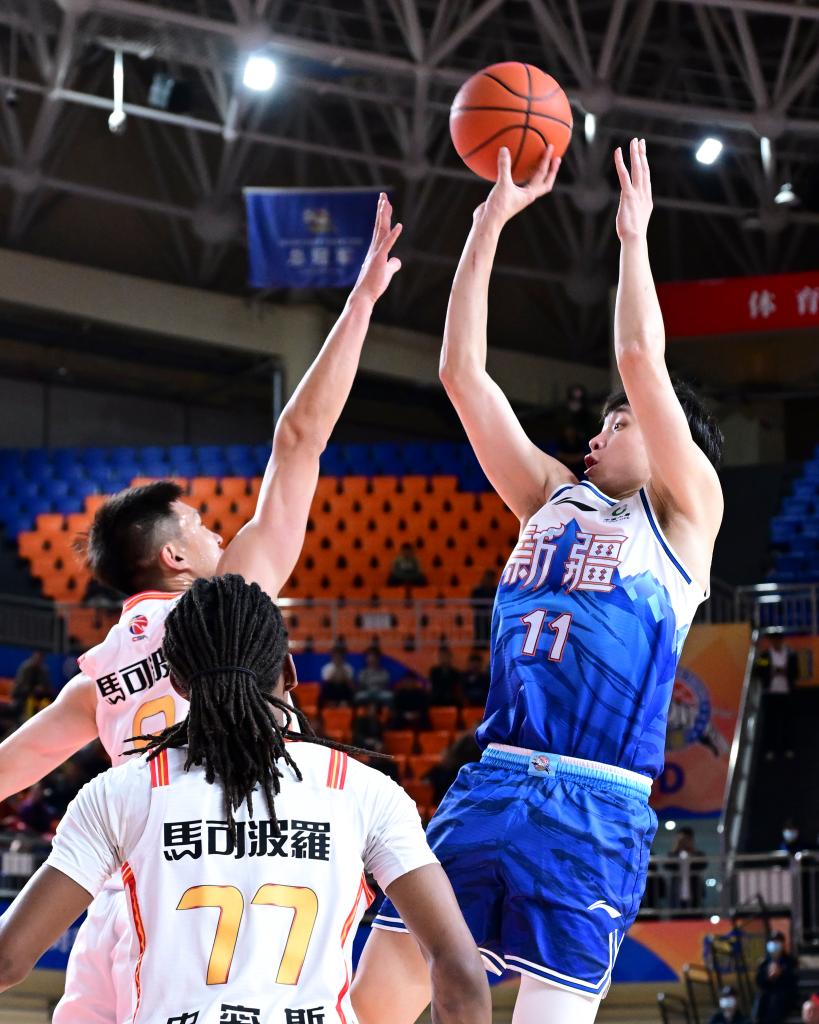 4月15日,新疆伊力特队球员齐麟(右)在比赛中投篮。新华社发(徐锐摄)