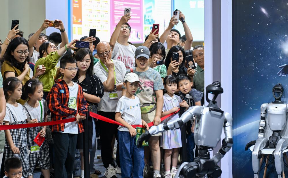 4月18日,参观者在第六届消博会现场观看宇树机器人跳舞。新华社记者 杨冠宇 摄