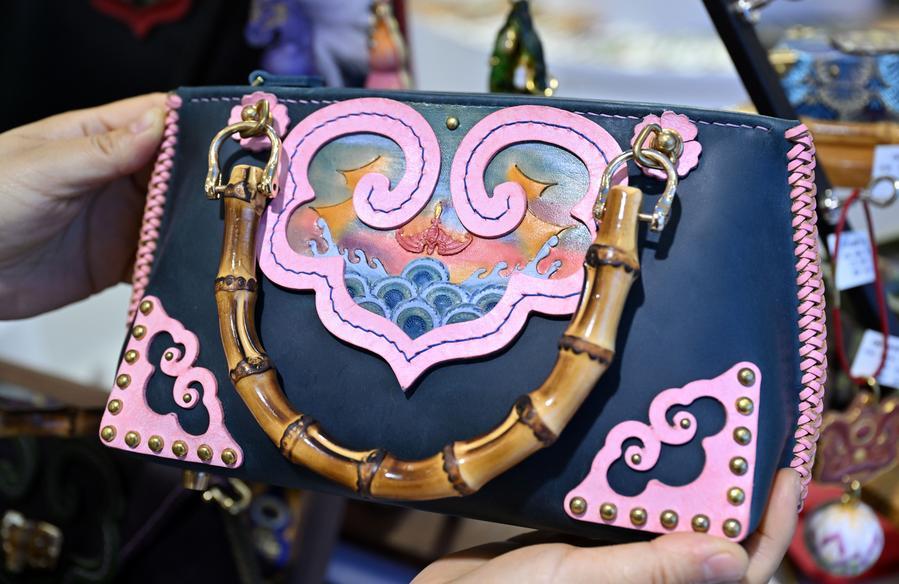 15日、第6回中国国際消費品博覧会の会場で展示された無形文化遺産である革に模様を彫り込むレザーカービングのハンドバッグ。(海口=新華社記者/郭程)