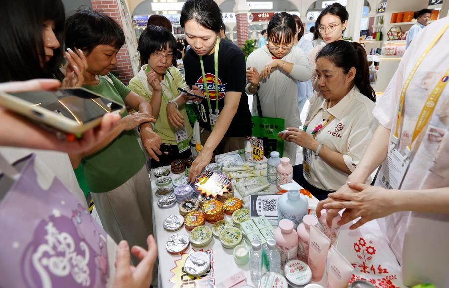 15日、第6回中国国際消費品博覧会の会場で国内スキンケアブランド「万紫千紅」の製品を購入する来場者。(海口=新華社記者/高静)