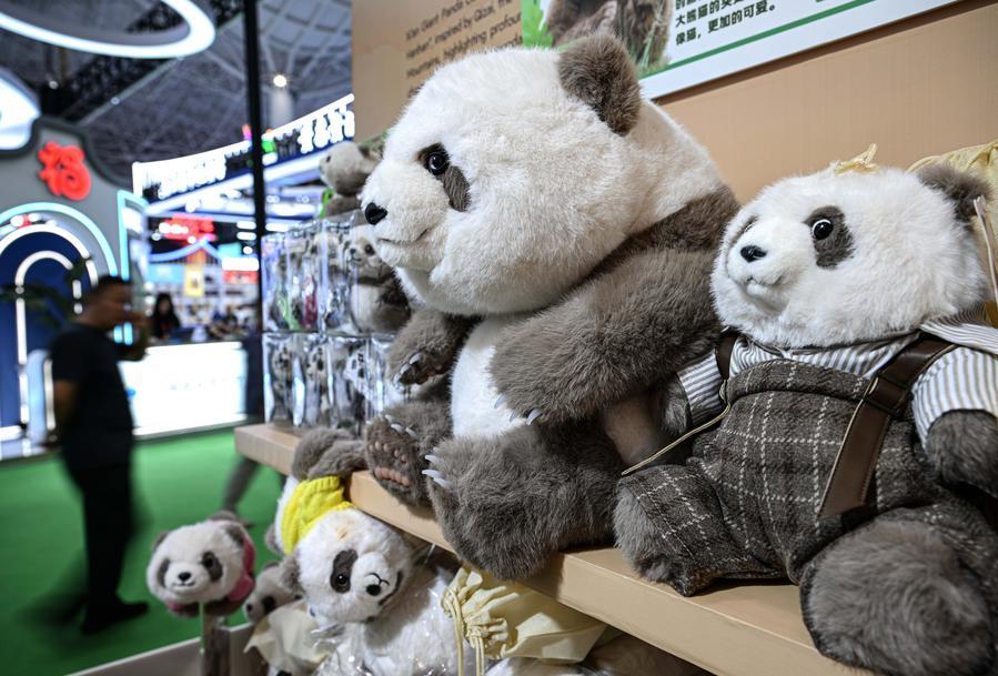 15日、第6回中国国際消費品博覧会の会場で展示された世界で唯一飼育されている茶色のジャイアントパンダ「七仔(チーザイ)」をモチーフにした文化クリエーティブ製品。(海口=新華社記者/蒲暁旭)