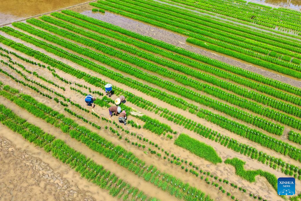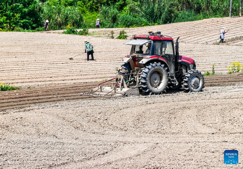 Farmers work in the fields of Weituo Town, Hechuan District, southwest China's Chongqing, April 18, 2026. The fields in Hechuan District of Chongqing are bustling with farming activity during the spring plowing season.