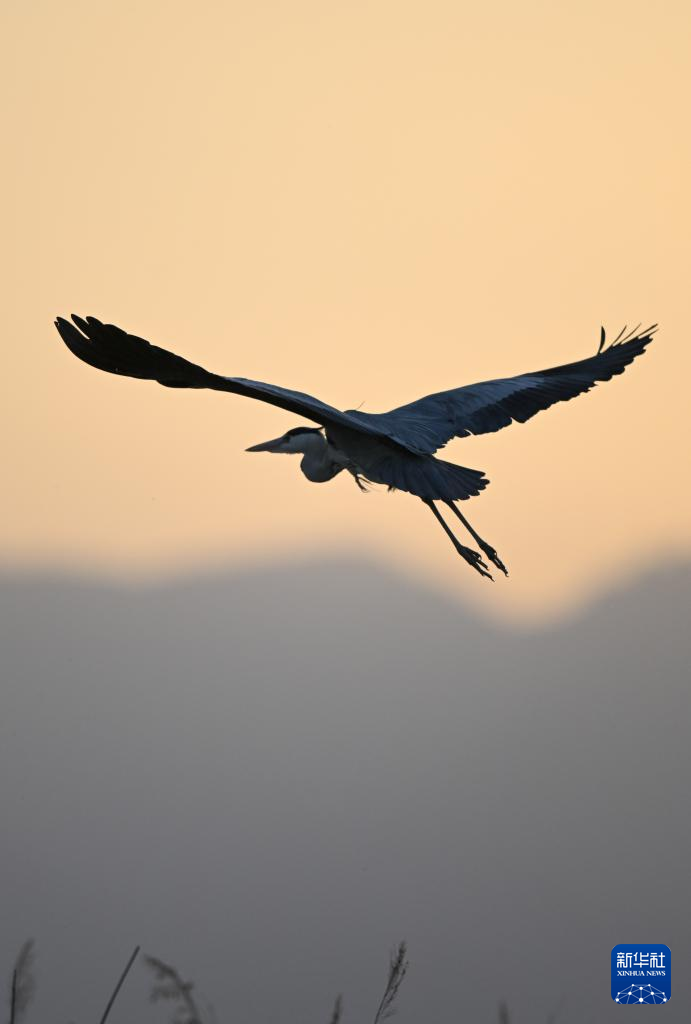 4月17日,苍鹭在夕阳中归巢。新华社记者 王鹏 摄