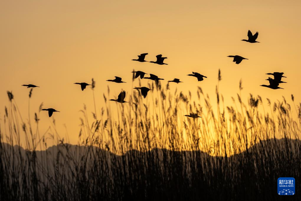 4月17日,鸬鹚在沙湖芦苇丛上空飞翔。新华社记者 王鹏 摄