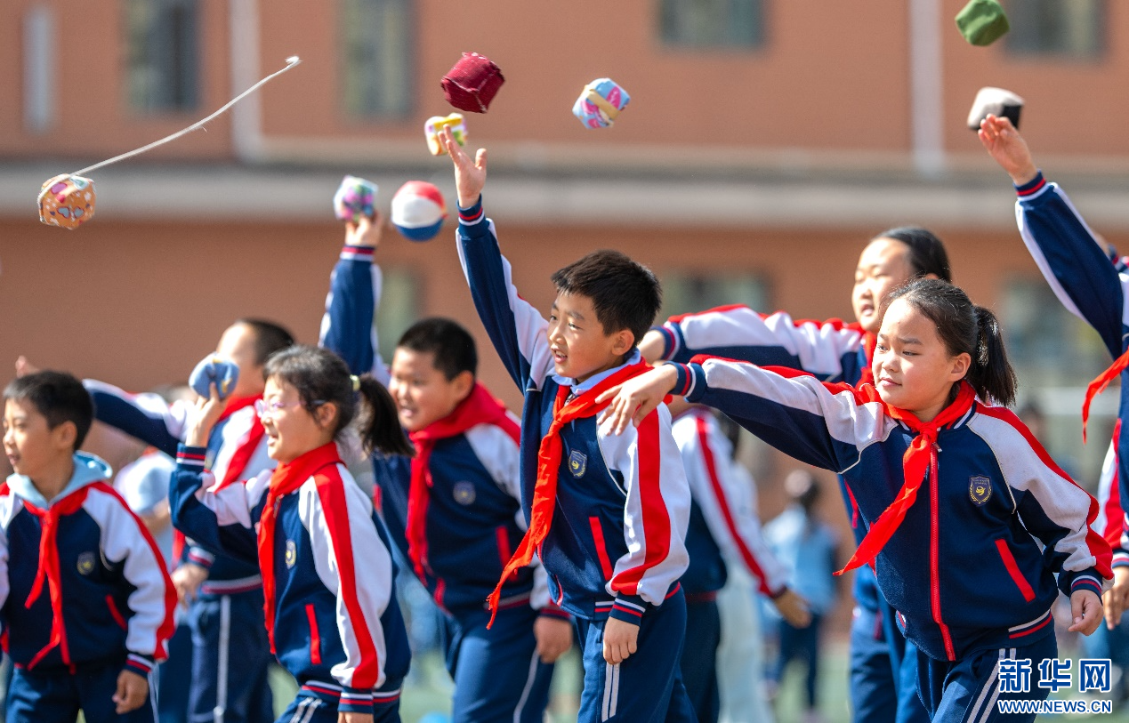 4月17日,呼和浩特市赛罕区腾飞路小学学生在大课间参加掷沙包趣味游戏。新华网发(王正 摄)