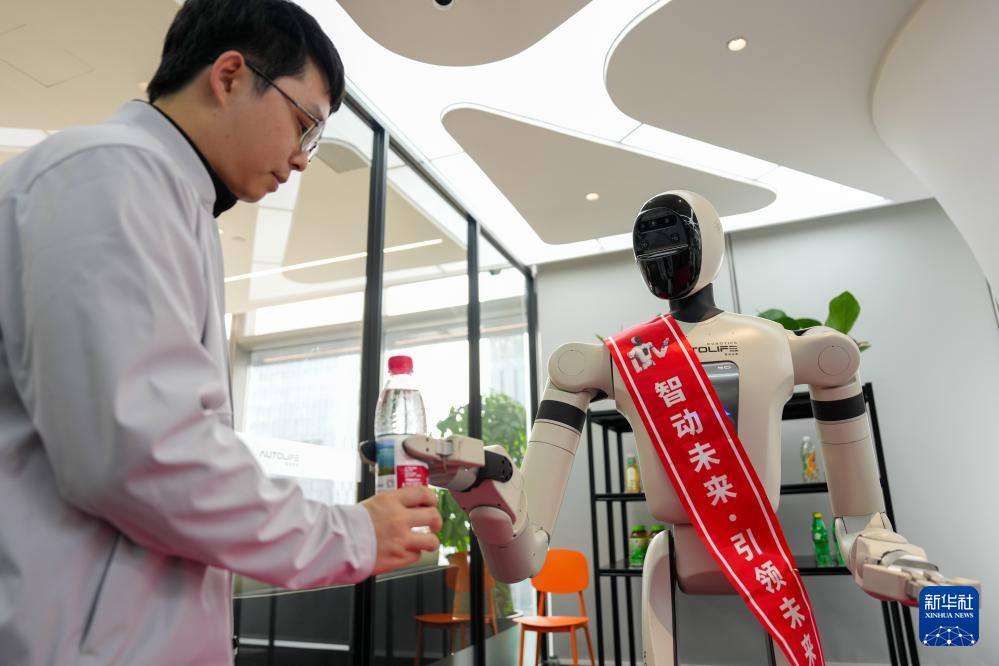 3月26日,在广东省广州市海珠区,广东智动未来科技有限公司创始人陈思为接过机器人递来的一瓶水。新华社记者 吴鲁 摄