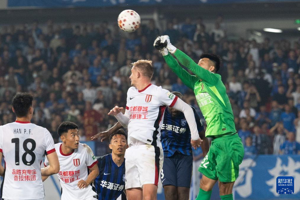 4月17日,成都蓉城队守门员刘殿座(右一)在比赛中扑救。新华社记者 肖艺九 摄